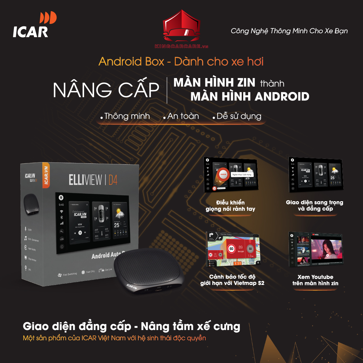 Android Auto Box Elliview D4 với rất nhiều những tính năng và tiện ích vượt trội, biến màn hình zin của xe thành màn hình android mà không cần đấu nối, thay thế chắc chắn là sự lựa chọn tuyệt vời nhất dành cho xế cưng của bạn.