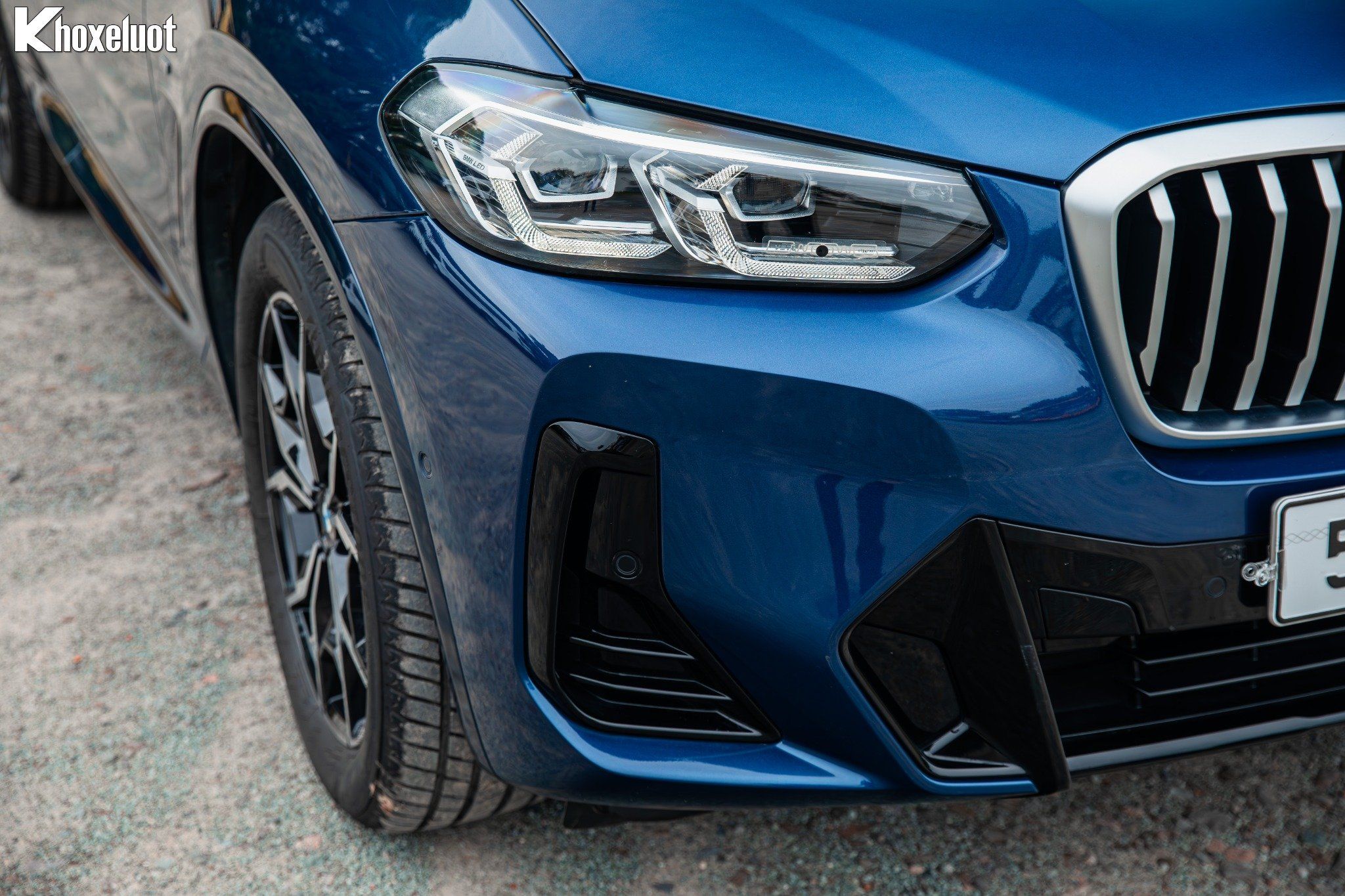 Phần đầu xe nổi bật với lưới tản nhiệt hình quả thận kích thước lớn, sơn đen bóng, tạo vẻ hầm hố và nhận diện thương hiệu rõ nét. Cụm đèn pha LED thích ứng (Adaptive LED Headlights) sắc sảo, tích hợp dải đèn LED ban ngày cá tính, mang lại khả năng chiếu sáng vượt trội. Cản trước M Sport với các hốc hút gió lớn, nhấn mạnh vẻ thể thao của chiếc xe.