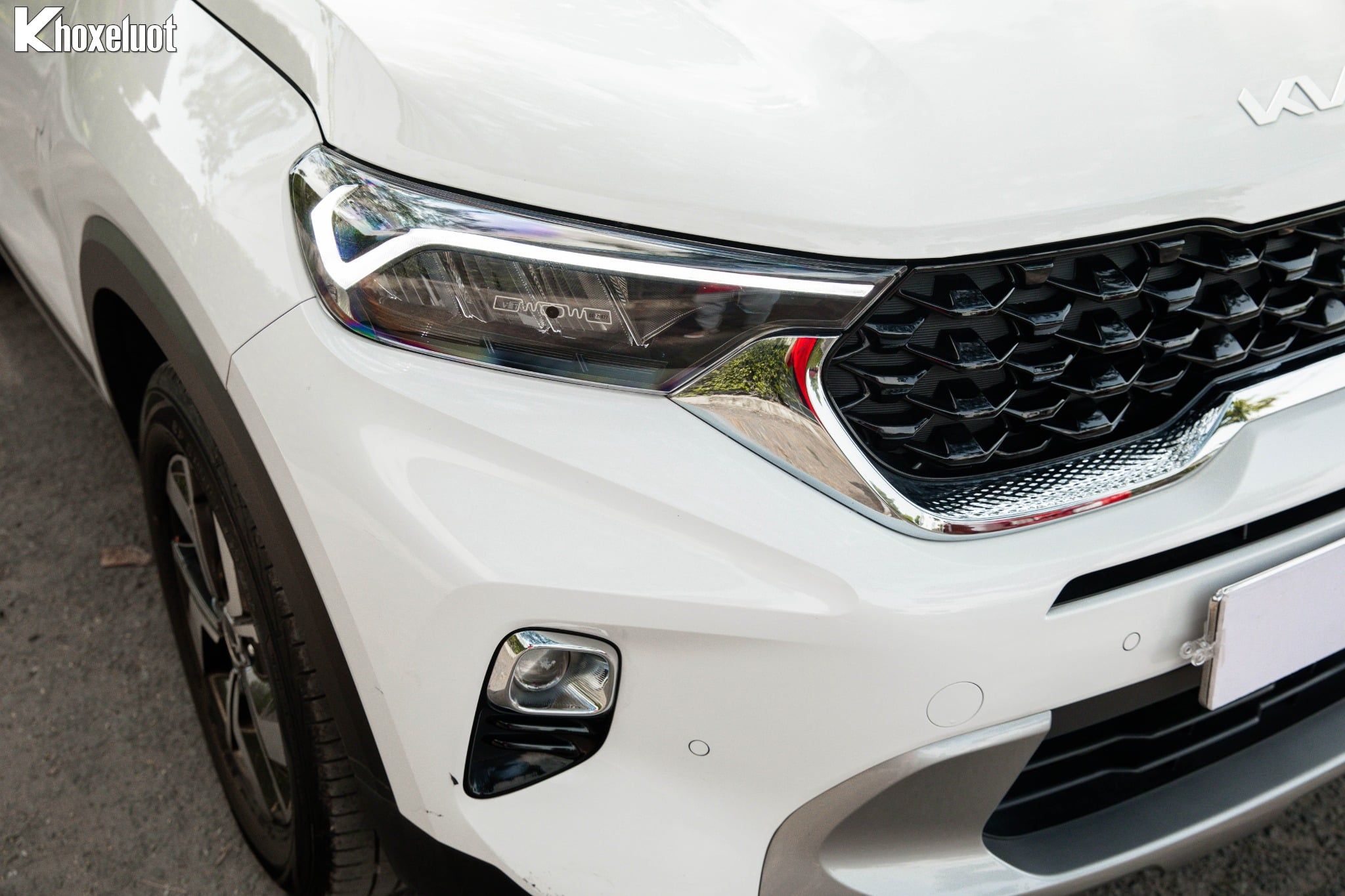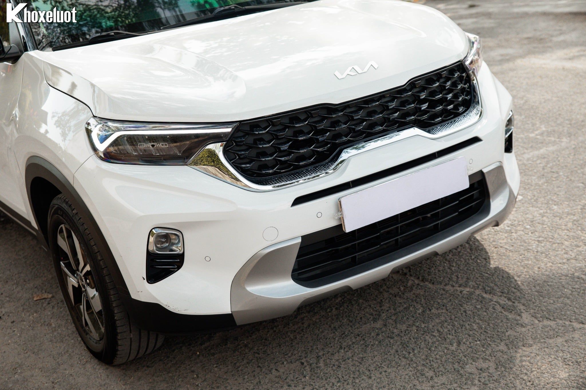 Phần đầu xe của KIA Sonet Luxury 2023 nổi bật với lưới tản nhiệt hình "Mũi hổ" đặc trưng nhưng được cách điệu bằng các họa tiết vân sóng tinh tế.