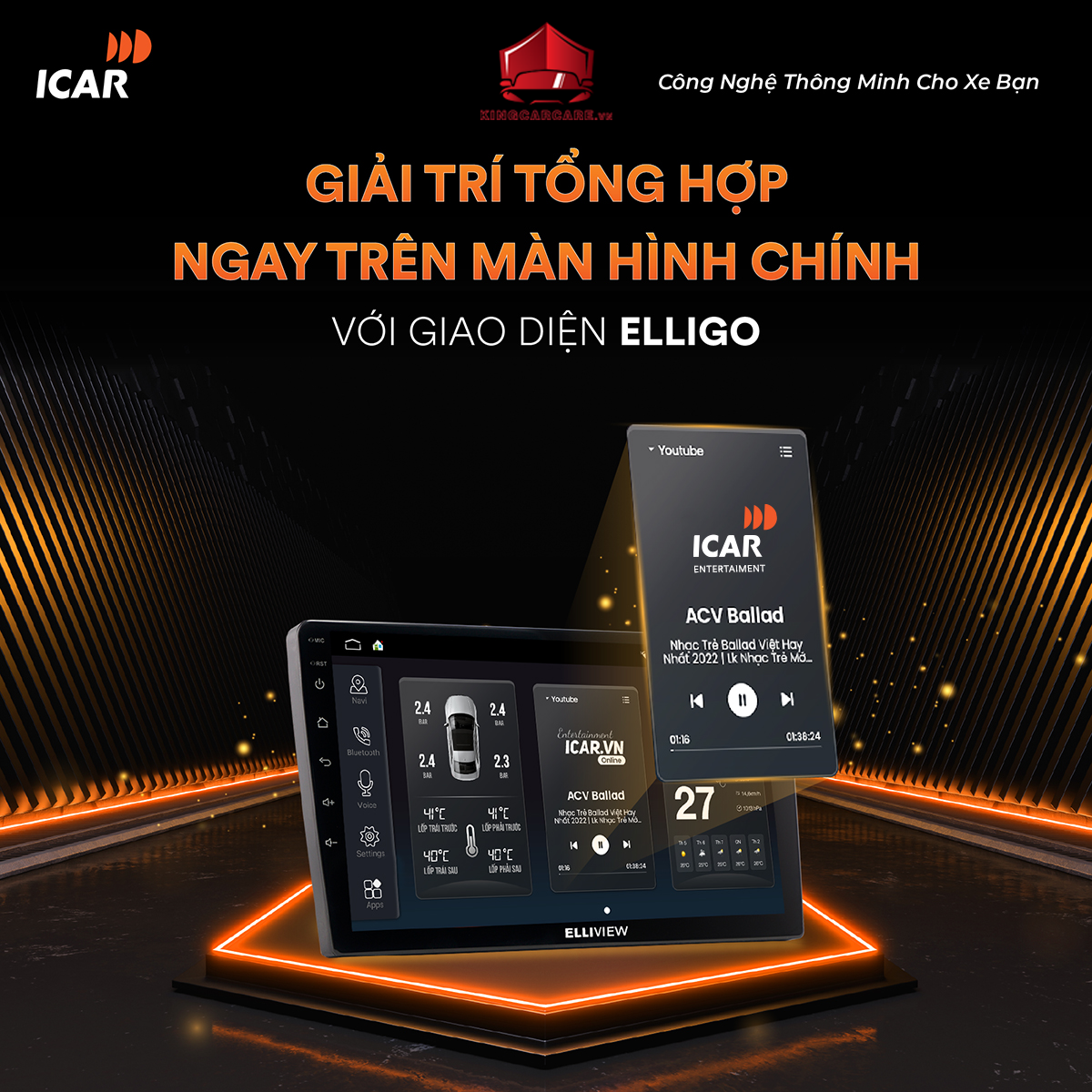 ICAR Entertainment – một phần mềm giải trí trên xe hơi được ICAR Việt Nam viết riêng cho các đầu Android của mình, tất nhiên là có Elliview S4. Việc nghe, xem các nội dung giải trí chở nên thuận tiện hơn bao giờ hết. Entertainment có thể chạy nền, có thể tiếp tục phát nội dung từ trước khi bạn tắt máy, có thể xem tivi, nghe radio online… đặc biệt, ICAR có sắp xếp các video theo các chủ đề như tin tức, review phim, thiếu nhi, tri thức… dành cho những người có nhu cầu. Bạn thậm chí còn có thể cài đặt nội dung tự phát cho mình mỗi khi nổ máy xe, cực kỳ tiện lợi. Với việc thiết kế dành riêng cho xe hơi, thao tác điều khiển ICAR Entertainment cũng đơn giản và dễ dàng bằng điều khiển giọng nói ICARV, hay việc bạn có thể mở full màn hình, tua chỉ bằng thao tác bấm đơn giản là bấm đúp, hay di chuyển tay trên màn hình. ICAR Entertainment cũng hoạt động tốt với các phím trên vô lăng khi bạn muốn qua bài, lùi bài…