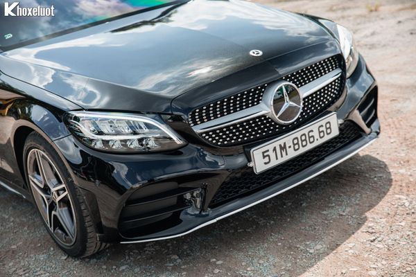 Phần đầu xe nổi bật với lưới tản nhiệt hình kim cương mạ chrome, kết hợp cùng logo "ngôi sao ba cánh" cỡ lớn ở trung tâm, tạo vẻ hầm hố và nhận diện thương hiệu rõ nét. Cụm đèn pha LED toàn phần sắc sảo, tích hợp dải đèn LED ban ngày cá tính, mang lại khả năng chiếu sáng hiệu quả và vẻ ngoài hiện đại. Cản trước AMG được thiết kế thể thao, nhấn mạnh sự trẻ trung.